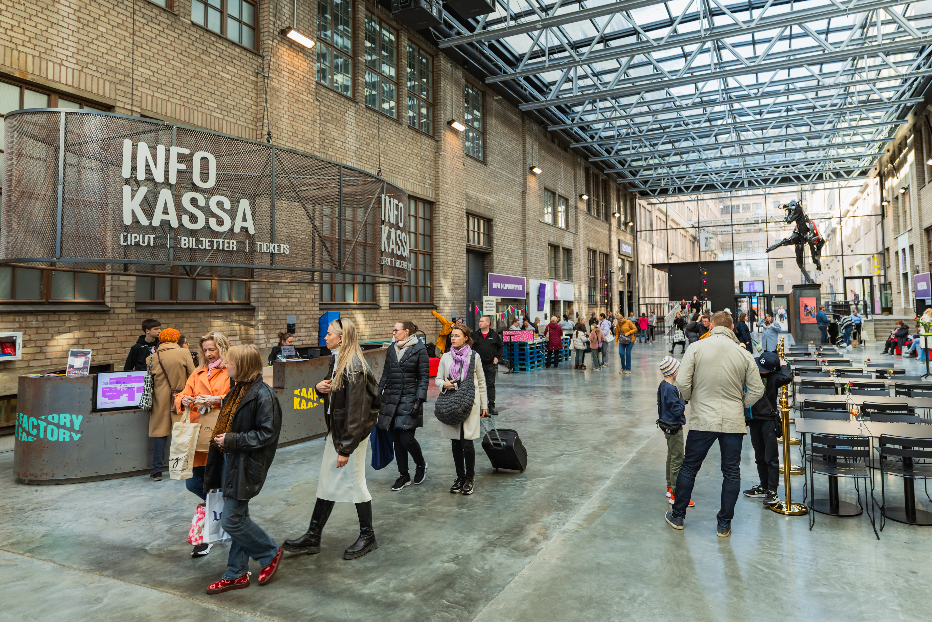 Lasipihalla kävijöitä palvelee infopiste, lipunmyynti sekä Tehtaanmyymälä.